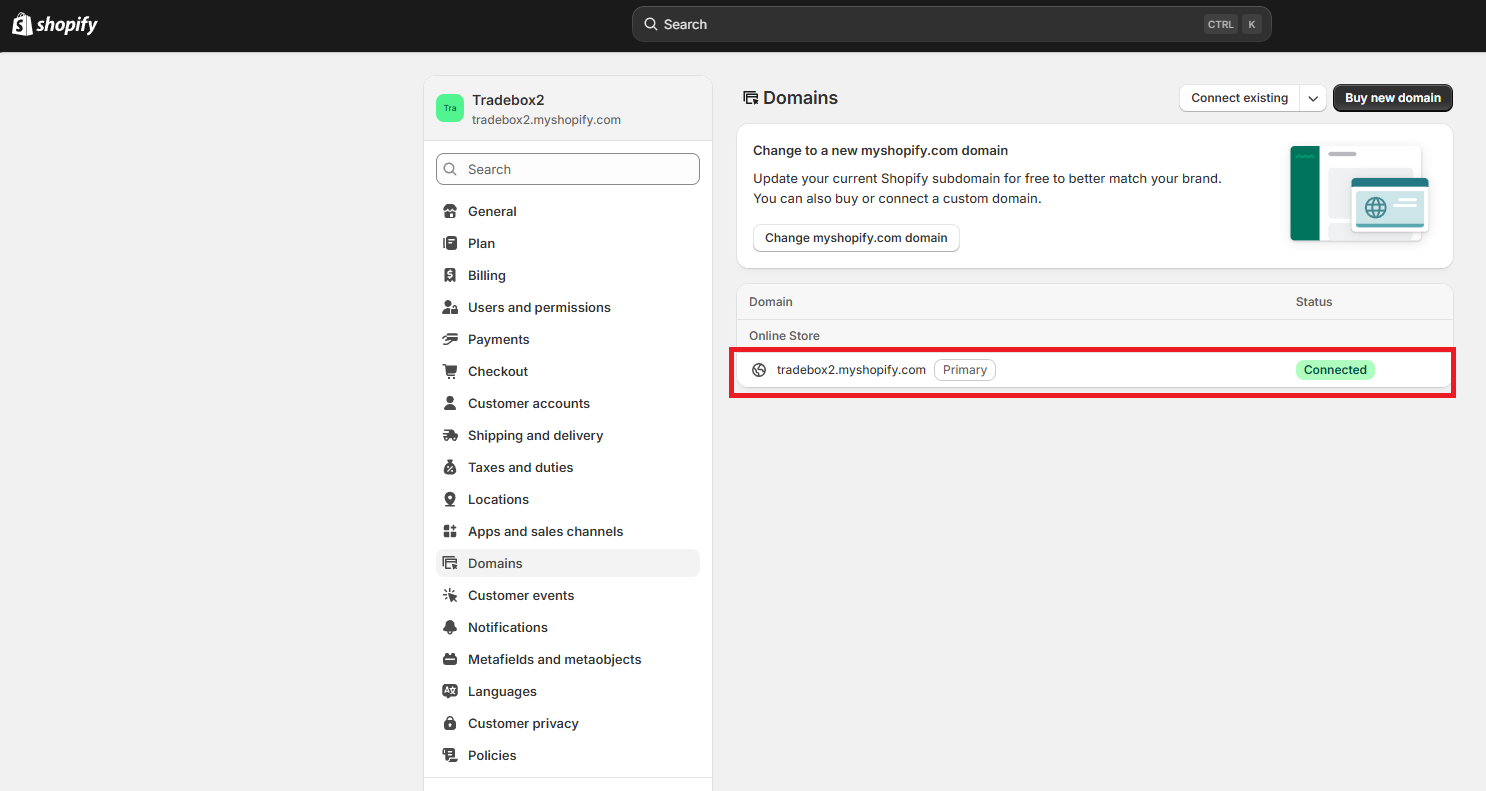Your domains are displayed here. If you have more than one, you should use the primary domain. Tradebox requires the url prefaced with https://, so if you were connecting to the Tradebox UK example below, you would enter https://tradebox-uk.myshopify.com as your url.
