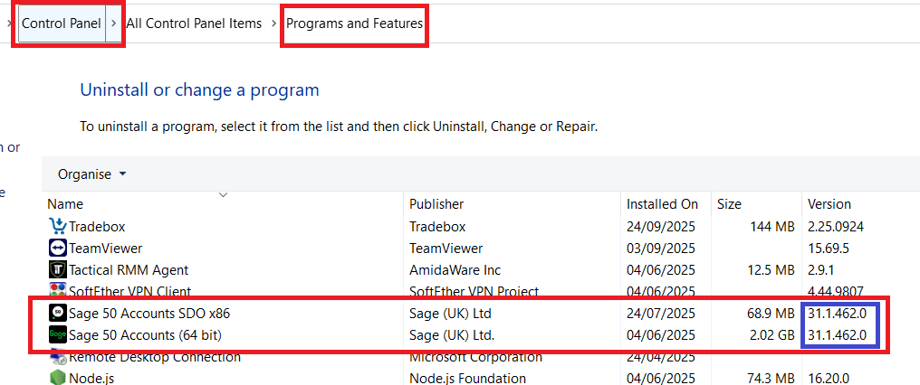 - Once installed, open Control Panel > Programs and Features and find the entry for Sage 50 Accounts SDO x86. This should have the exact same version number as the Sage 50 Accounts SDO x86.