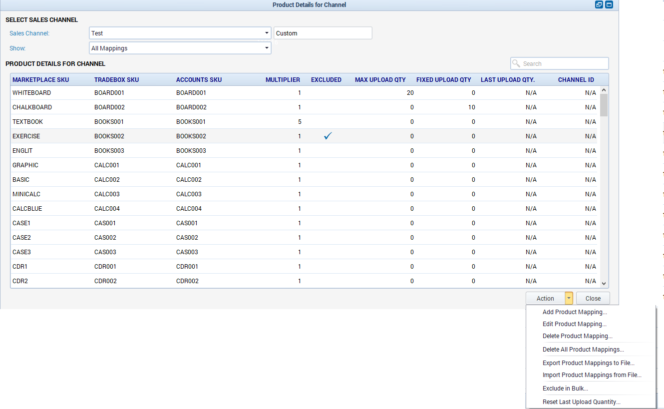 The next two options on the Action menu are Delete Product Mapping and Delete All Product Mappings. The first will delete the mapping(s) you have selected in the grid, whereas Delete All Product Mappings will completely remove all mappings for this channel. We'd advise taking a backup before deleting any significant number of mappings.