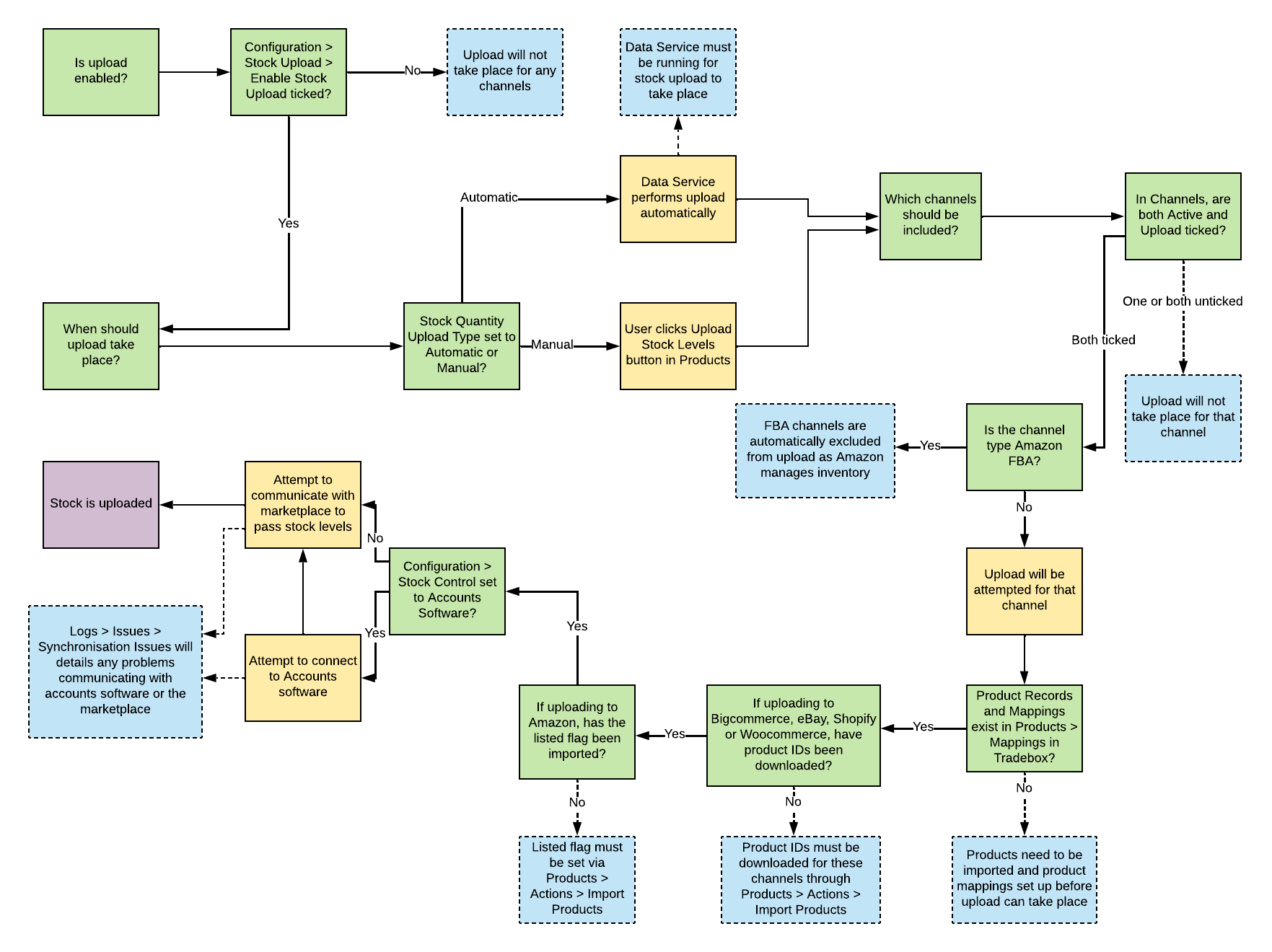 The flowchart below covers every check that Tradebox makes and every process it performs on the way to uploading stock. This applies if Tradebox is not uploading stock levels at all, or if no stock upload is taking place at all for a particular channel. Click on the image to enlarge, or click here to download it as a PDF.