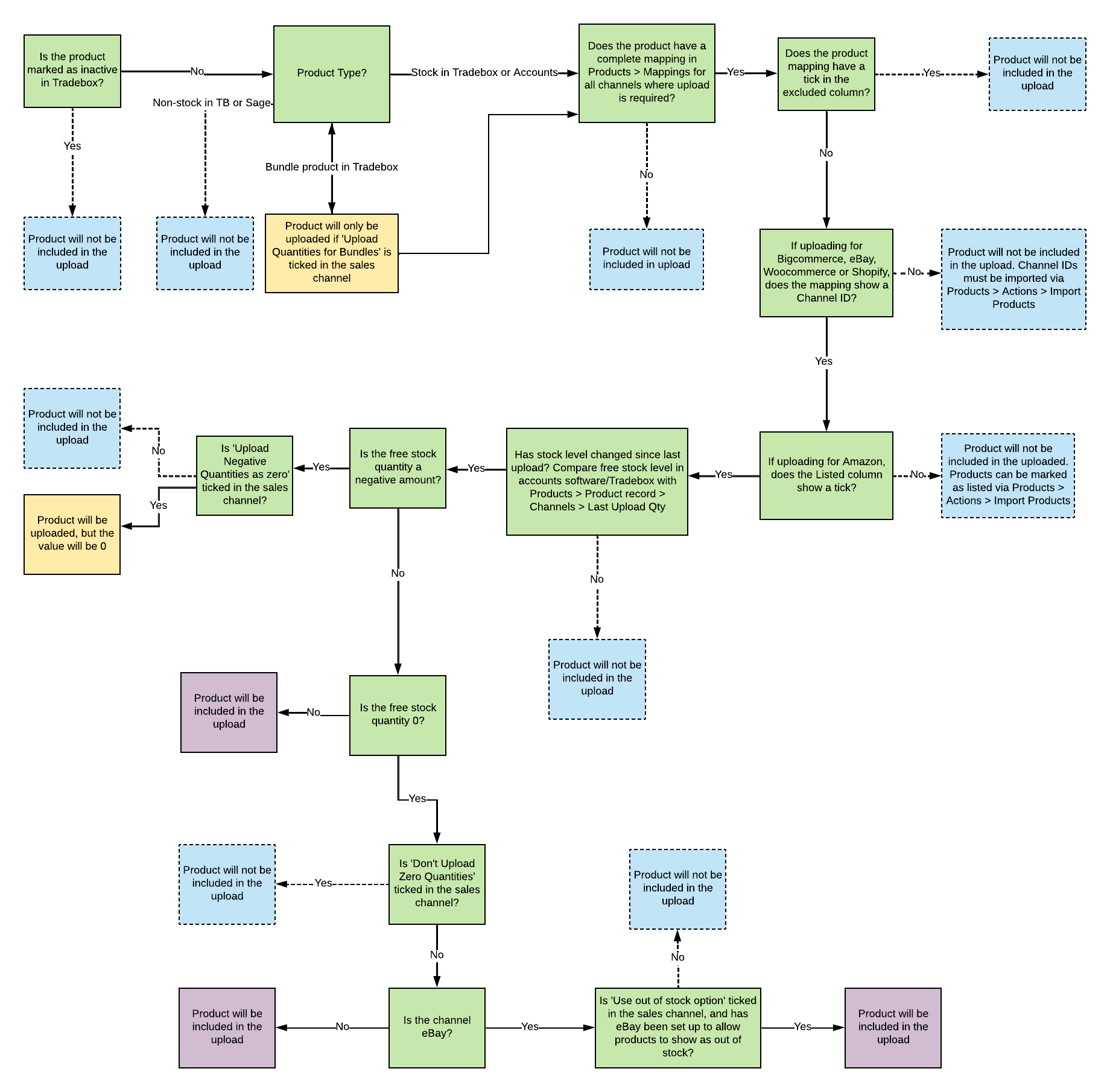 The flowchart below details all of the checks that Tradebox makes when it decides which products to include in the stock upload to your site. Click on the image to enlarge it or click here to download the PDF.